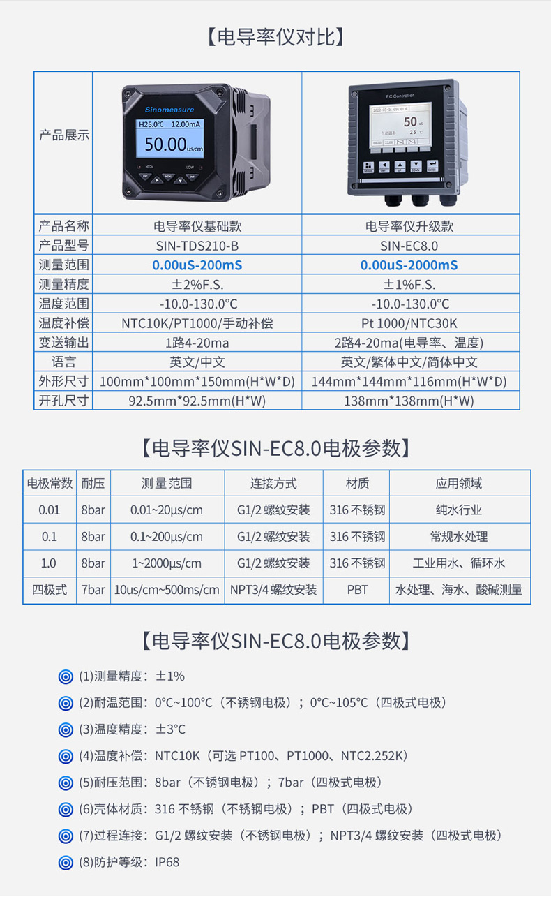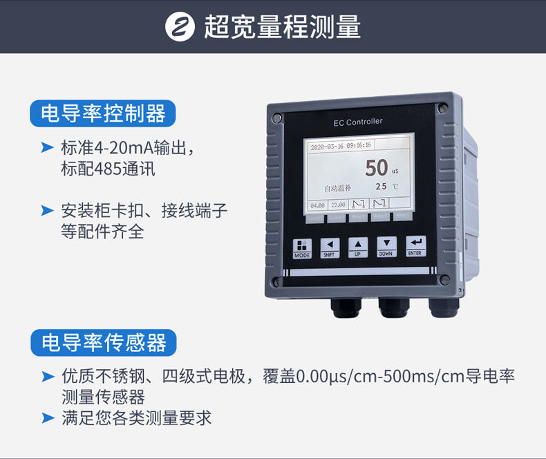 SIN-EC8.0工業(yè)電導(dǎo)率儀表,大屏顯示,可對(duì)各種工業(yè)用水的電導(dǎo)率(TDS)值進(jìn)行連續(xù)測(cè)量和控制,本裝置廣泛應(yīng)用于科學(xué)實(shí)驗(yàn)裝備、化工、制藥、環(huán)保、冶金、造紙、食品、飲料及供水等行業(yè)。根據(jù)水工業(yè)的環(huán)境和特點(diǎn)結(jié)合國(guó)際供電標(biāo)準(zhǔn),考慮了特殊環(huán)境的電氣設(shè)計(jì)規(guī)范,增加了220VAC供電。