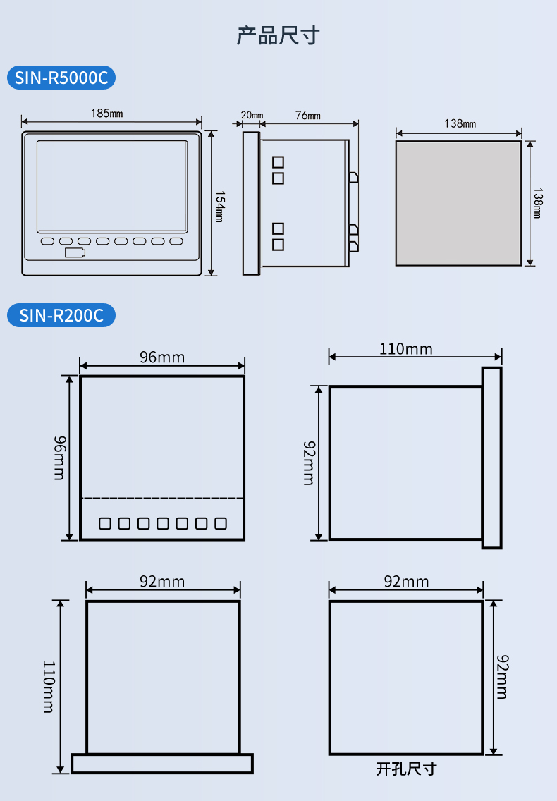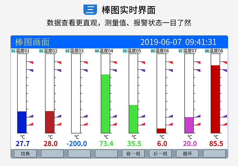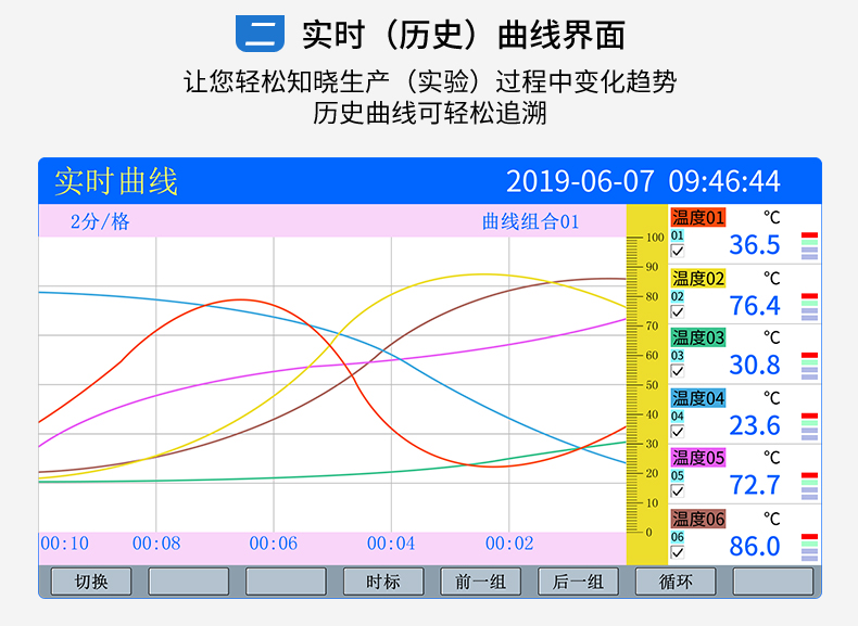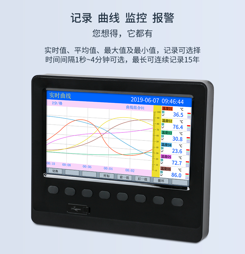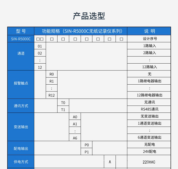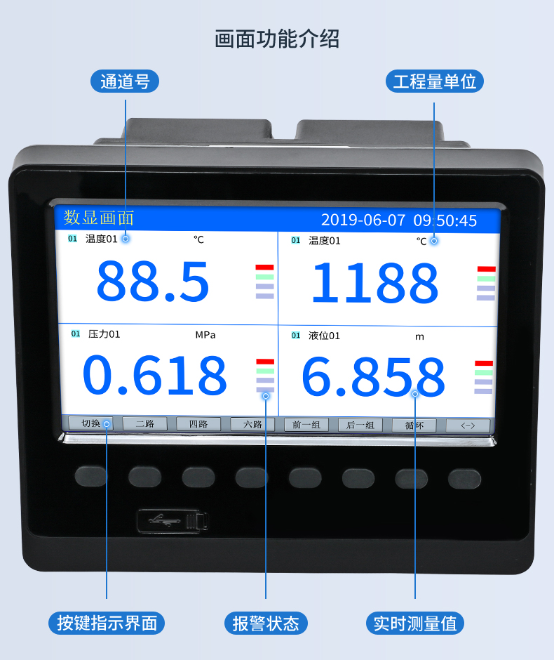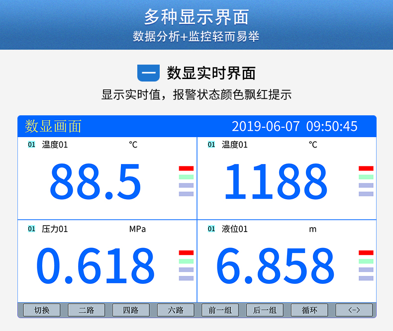 SIN-R5000C無紙記錄儀 12 路萬能輸入(可組態(tài)選擇輸入:標(biāo)準(zhǔn)電壓、標(biāo)準(zhǔn)電流、熱電偶、熱電阻、毫伏等)??蓭?12 路報警輸出或 6 路模擬量變送輸出,RS485 通訊接口,以太網(wǎng)接口,微型打印機接口和 USB 接口,SD 卡插座;可提供傳感器配電;具有強大的顯示功能,實時曲線顯示,歷史曲線追憶,棒圖顯示,報警列表顯示等。人性化的外觀設(shè)計、完美的功能體現(xiàn)、可靠的硬件品質(zhì)、精湛的制造工藝,使儀表具有更高的性能價格比。