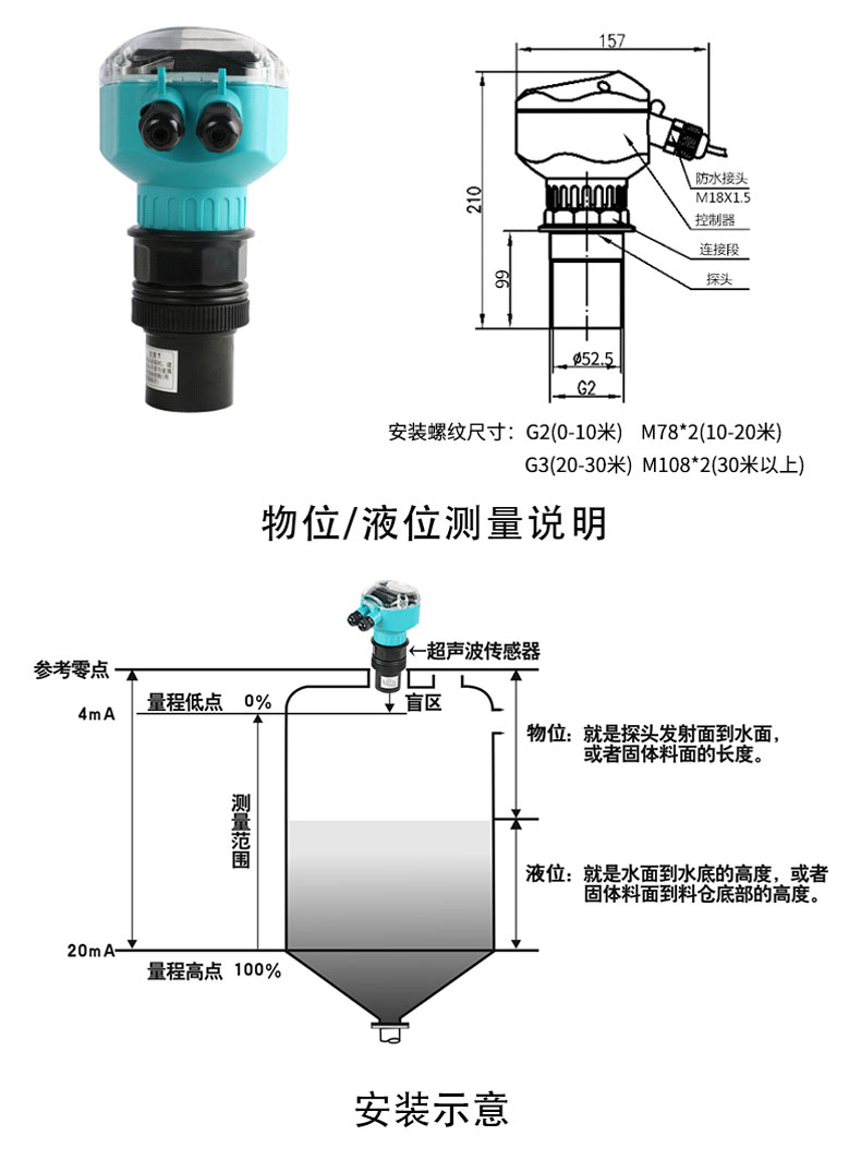 在測量中超聲波脈沖由傳感器(換能器)發(fā)出,聲波經(jīng)液體表面反射后被同一傳感器接收或超聲波接收器,通過壓電晶體或磁致伸縮器件轉(zhuǎn)換成電信號,并由聲波的發(fā)射和接收之間的時(shí)間來計(jì)算傳感器到被測液體表面的距離。 由于采用非接觸的測量,被測介質(zhì)幾乎不受限制,可廣泛用于各種液體和固體物料高度的測量。