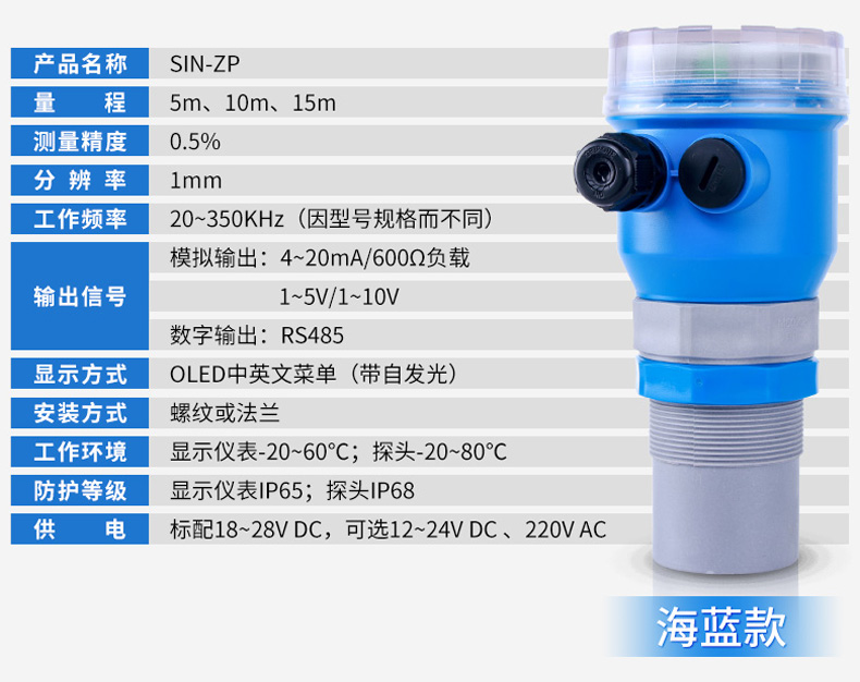 SIN-MP超聲波液位/物位計采用超聲波脈沖原理進行非接觸式的測量,是一種非接觸式、高可靠性、高性價比、易安裝維護的物位測量儀器。它不必接觸介質(zhì)就能滿足大部分物位測量要求,集液位水位測距顯示變送等功能于一體,被測介質(zhì)幾乎不受限制,可廣泛應(yīng)用于各種液體和固體物料高度的測量。